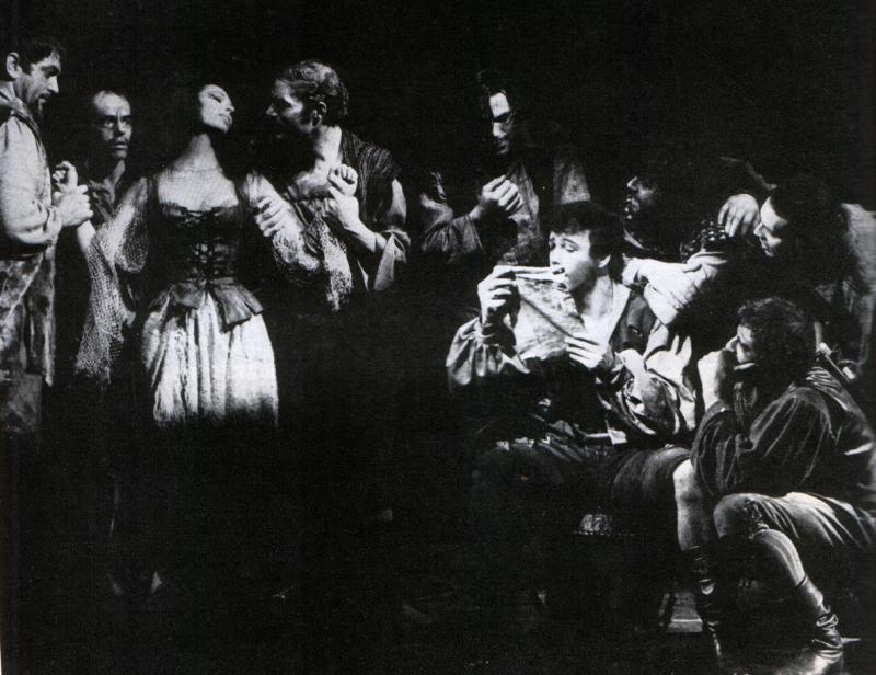 Joan Diener as Aldonza with the muleteers in the missive scene.