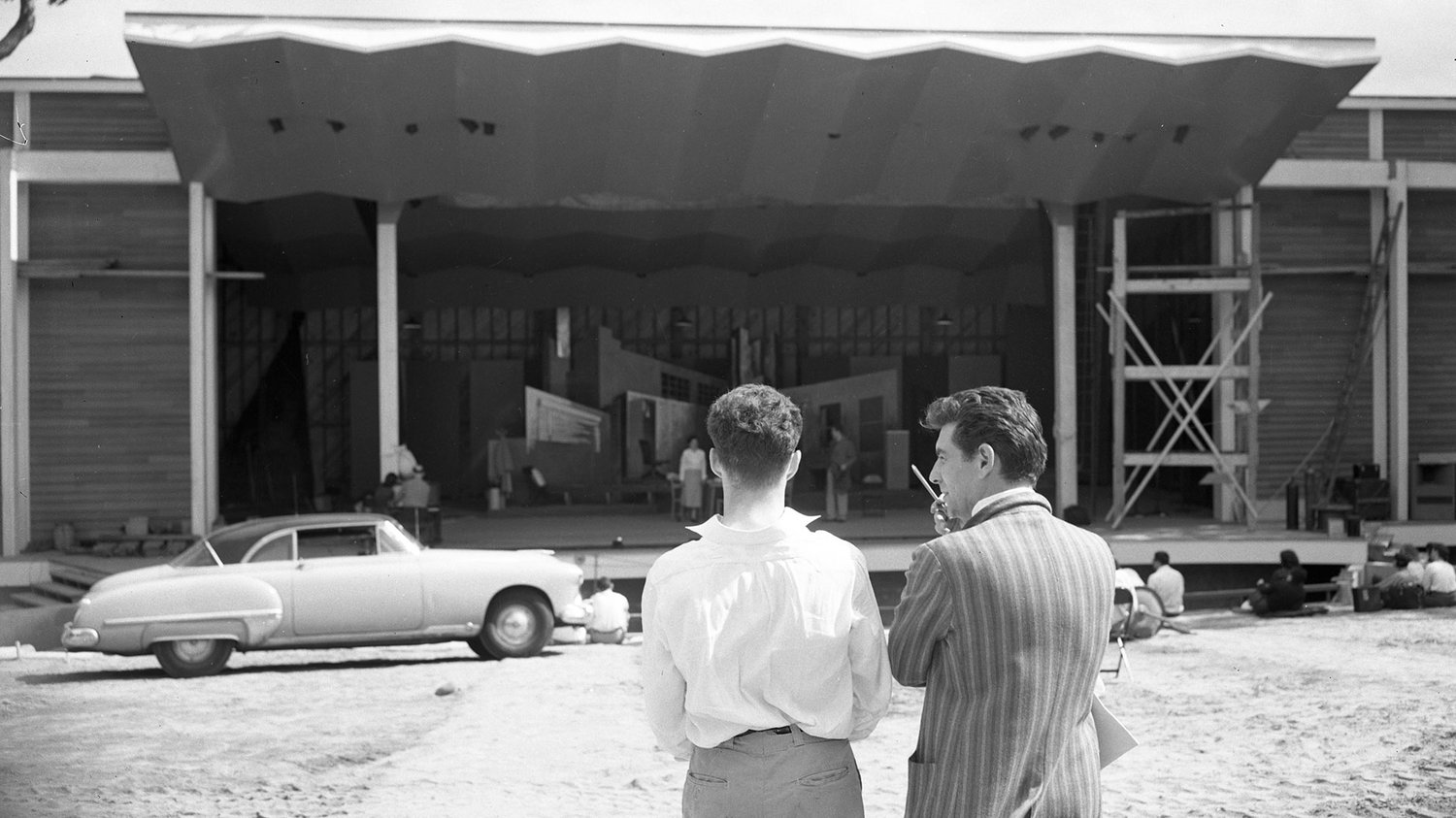 Bernstein standing in front of the set.