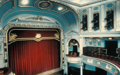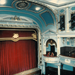 Many interior details in the Mertz Theatre (plasterwork, ornate cornices, wall panels, friezes, carved box fronts, proscenium, ceiling arches, etc.) are re-used from the Dunfermline Opera House of Dunfermline, Scotland, UK. The Opera House was operational from 1903 to 1955. Before the building was demolished in 1982, the Scottish Arts Council saved the theatre's interior and stored it in pieces. Four years later, Asolo Repertory Theatre learned about the mothballed theatre and imported it to Sarasota, Florida. About 80% of the original ornamentation was used in the auditorium of the Mertz Theatre in the newly built Asolo Center for the Performing Arts.