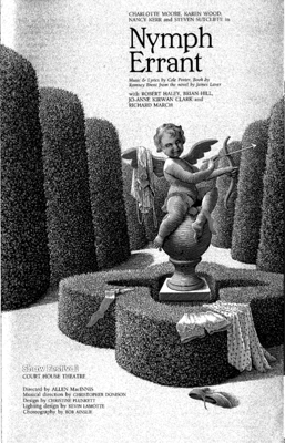 There were significant changes to this return run of the 1989 Shaw Festival production. Several songs cut from the original production of Nymph Errant were added this time around, and judging from the program, there were probably some changes to the book in addition to those needed to include the extra songs. In addition, there were cast changes.