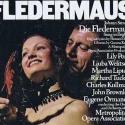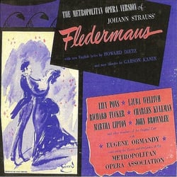 Patrice Munsel (as Adele) and Risë Stevens (as Prince Orlofsky) were in the cast of the Metropolitan Opera premiere of the Howard Dietz-Garson Kanin adaptation on Dec 20. 1950, but they do not appear on this recording. Lily Pons and Martha Lipton, who sang never sang those roles (or any role) in the Met production, sing Adele and Orlofsky on this recording. Recorded December 24 and 29. 1950, and January 7, 1951 this recording has the opening-night conductor and some principals from the original cast. Another change from the opening-night cast is Charles Kullman as Eisenstein, in place of Set Svanholm. Kullman, however, sang the role regularly in the production, starting at the third performance.